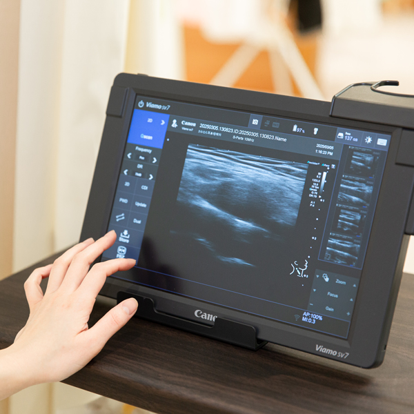 超音波を手のひらサイズの機械から体内に送り、その反射波から頸部皮膚表面から約5cm以内の組織臓器の大きさや形状などを調べる検査です。炎症性病変から腫瘍まで、幅広い病気の発見につなげることができます。